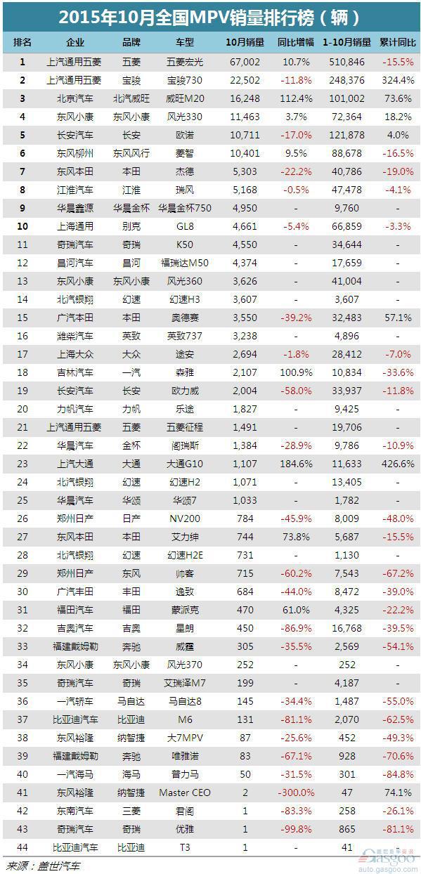 10月份国内SUV市场总计统计44款车型,销售前十车型依次是五菱宏光、宝骏730、威旺M20、风光330、欧诺、菱智、杰德、瑞风、华晨金杯750、别克GL8。其中,五菱宏光以6.70万辆成绩继续稳居榜首,该企业旗下另一款车型宝骏730以2.25万辆次之;新车华晨金杯750销售4,950辆,排名第八位。