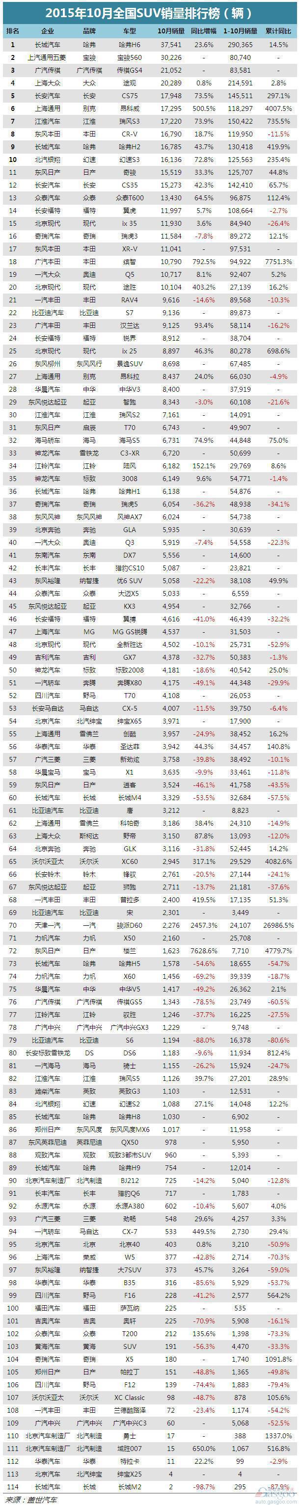 国内SUV市场总计统计114款车型。其中,表现最为抢眼的仍属“黑马”宝骏560,其9月排名跃升至第二位,10月以3.02万辆销量保持在该名次,仅次于哈弗H6。