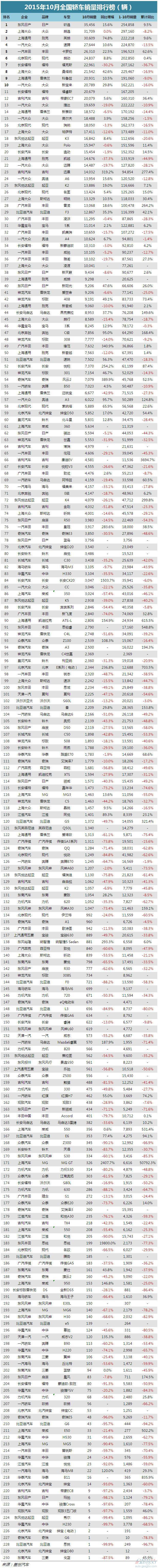 最全最直观的10月份388款车型销量排行榜