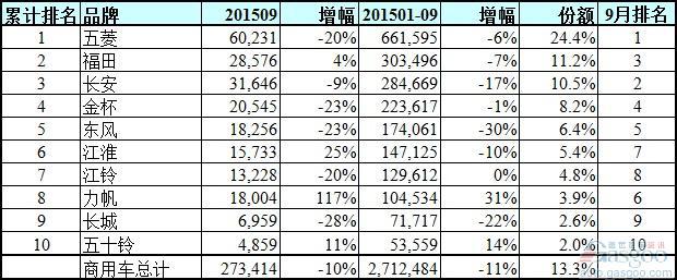 在销量前十名的商用车品牌中,只有排在第10位的五十铃为外资品牌。五菱依然稳居第一,但9月销量跌落20%。10个品牌中,只有力帆和五十铃实现同比增长。力帆9月销量同比暴涨117%,累计销量增幅也高达31%。