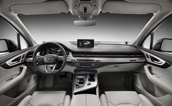 内饰方面,新一代Q7传统的中控台因为副仪表板的向上提升而被弱化,仅保留了空调的操作面板。空调出风口被弱化为整个内饰饰板的一部分,音响以及MMI信息交互系统则通过中控台顶部的触控显示器实现。这一套升级之后的MMI信息交互系统还可以与安卓系统和苹果 CarPlay系统的兼容。