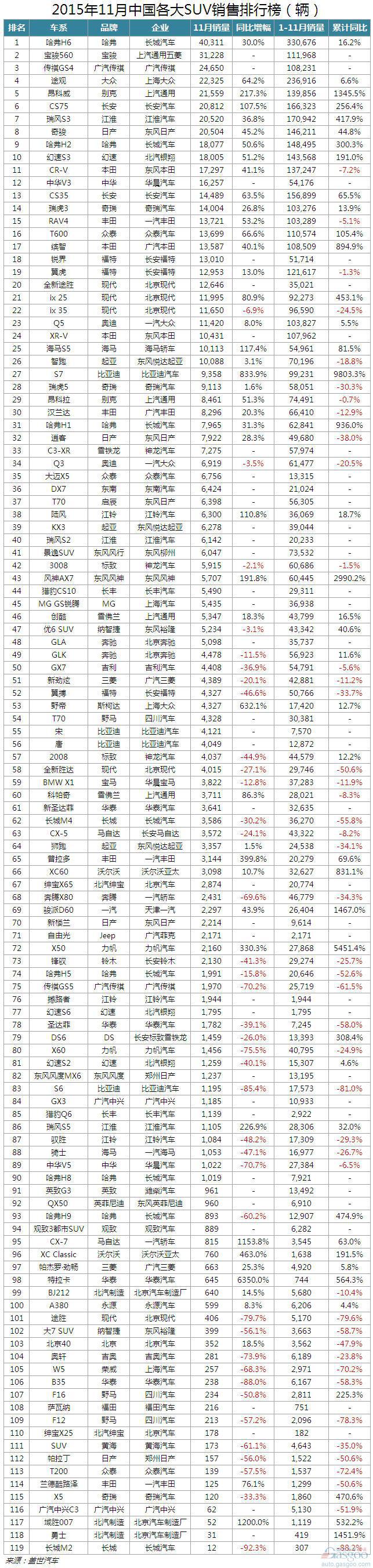 国内SUV市场总计统计119款车型。其中,自主品牌具有明显优势,前十车型占据七席,且再次包揽前三。