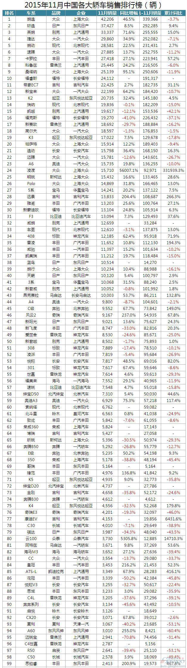 盖世汽车根据乘联会数据,整理出各类乘用车11月份销量排行榜,以飨读者。本次榜单总计统计391款,其中对英朗、福克斯等车型按照nameplate车名进行了新老款合并。