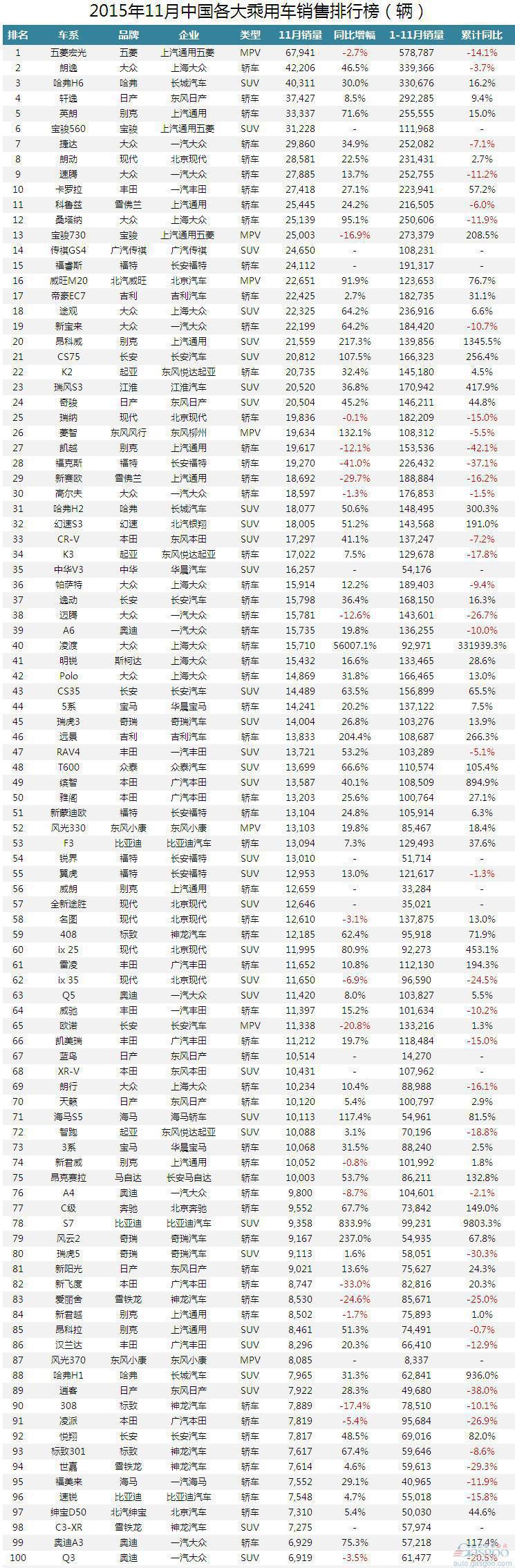 中国车市11月所有乘用车销量排行榜