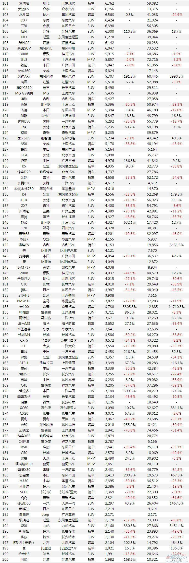 本文统计的乘用车车型共计有391款。其中,五菱宏光、朗逸和哈弗H6分别以6.79万辆、4.22万辆、4.03万辆排名总榜单的前三甲,而且分别是MPV、SUV和轿车销量冠军。不过与去年同期相比,榜首的五菱宏光由于老款车型的退出销量出现2.7%的下跌走势,而朗逸和哈弗H6分别实现46.5%和30%的高幅增长。