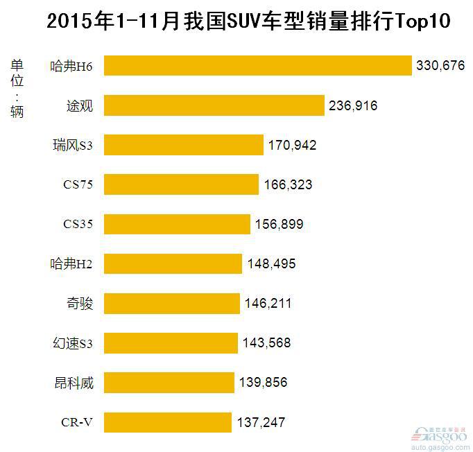 2015年1-11月我国SUV车型销量排行Top10