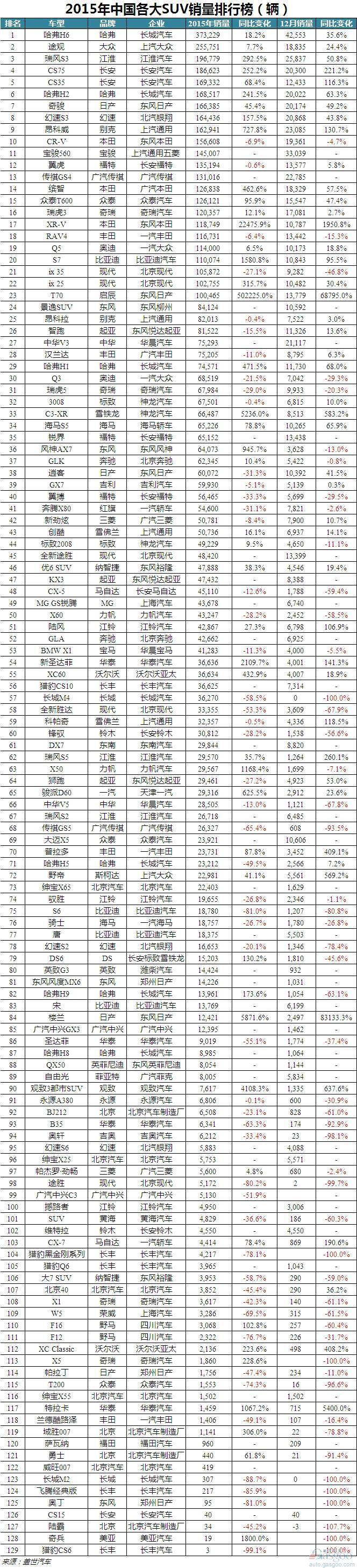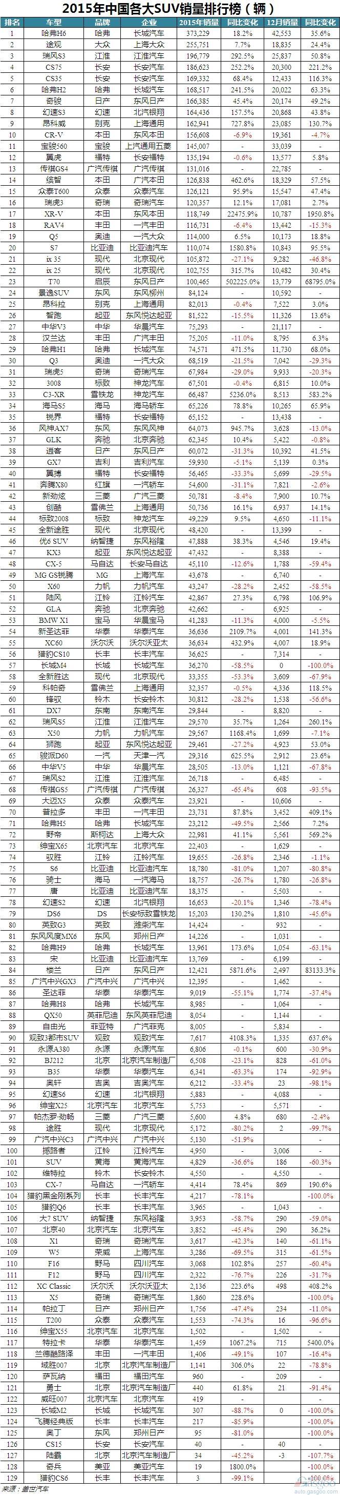 国内SUV市场总计统计129款车型。其中,自主品牌具有明显优势,前十车型占据六席。哈弗H6以绝对的销量优势蝉联SUV年度销量冠军,实现 373,229辆。