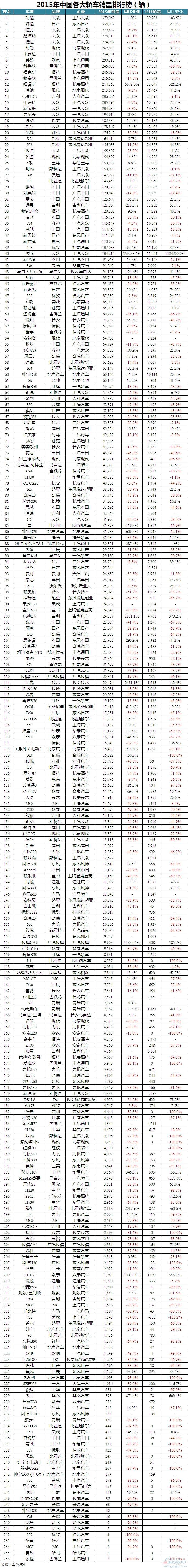 2015年最全最直观的437款车型销量排行榜