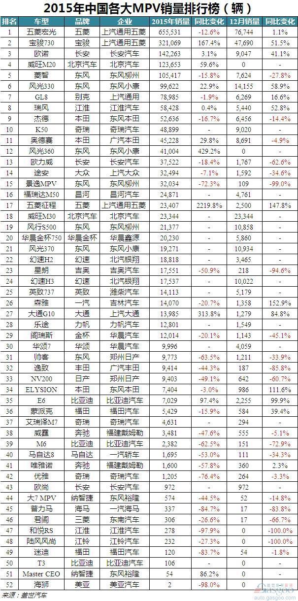 2015年国内MPV市场总计统计52款车型,销售前十车型依次是五菱宏光、宝骏730、欧诺、威旺M20、菱智、风光330、别克GL8、瑞风、杰德和奇瑞K50。其中,五菱宏光以655,531辆的销量成绩夺得2015年MPV市场销量冠军,但是却出现了12.6%的下跌,紧随其后的是同旗下的宝骏730,2015年销量实现321,069辆;新车K50销售48,899辆,排名第十位。