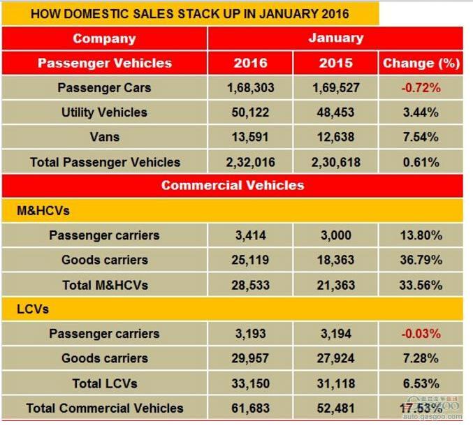 2016年1月印度新车销量统计