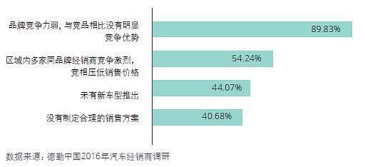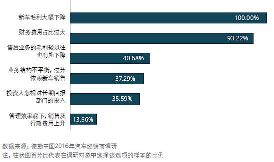 由于新车库存过高,严重侵占运营资金,经销商不得以而采取“降价走量”方式削减库存缓解资金周转压力,依靠厂商商务返利补充现金流。从上市经销商集团平均新车销售毛利率的变动趋势可以看出,新车利润空间正被不断挤压。根据2016年德勤调研结果,导致新车销售毛利率下降的原因主要包括: