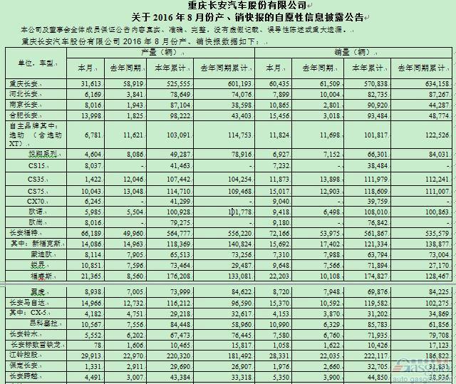 日前,长安汽车官方公布了2016年8月产销快报。数据显示,长安汽车8月共计销售226,486辆,同比增长26.6%。1-8月累计销售1,901,459辆,同比增长5.2%。其中长安品牌汽车累计销售超108万辆,同比增长5.8%;长安品牌乘用车累计销售78.4万辆,同比增长17.8%。