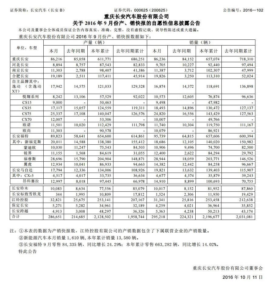时至10月,车市的“金九银十”也过去一半,各大车企也陆续公布9月份的销量数据。日前长安汽车官方公布了9月份的产销快报,盖世汽车通过梳理数据发现:长安汽车各系车型9月总销售为295,218辆,同比8月份增长30%;2016年前9月累计销售汽车2,196,677辆,并且长安自主品牌销量创下新纪录,共有7款自主车型月销过万,SUV车型成为最大赢家。