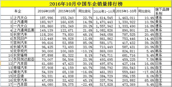 根据乘联会最新数据,盖世汽车整理了2016年10月中国车企狭义乘用车批发销量排行榜。延续“金九”的火热,“银十”车市依然向好。数据显示,2016年10月份,中国狭义乘用车批发销量达2,306,340辆,同比增长22%,环比增长3.8%。1~10月累计销售18,538,394辆,累计同比增长17.8%。而从本次所统计的68家车企销量上来看,多家车企销量数据创出月度新高,而自主品牌依旧保持着相当强悍的增长。