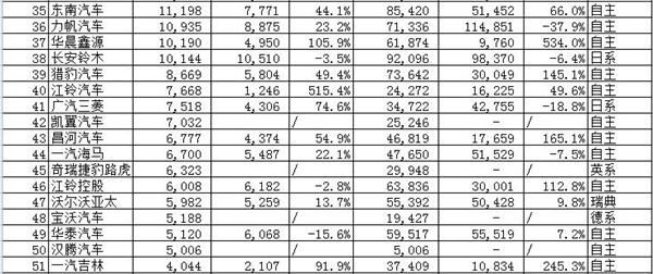 除了三强外,自主品牌中同样需要给予鲜花和掌声的还有上海汽车、广汽乘用车、东风小康、东风乘用车、华晨鑫源、江铃汽车、昌河汽车、一汽吉林,增幅分别为:147.1%、52%、67.8%、69.8%、105.9%、515.4%、54.9%、91.9%。