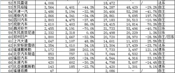 除自主品牌外,本次统计车企中还涉及德系7个,其中5家实现增长,1家销量下滑,1家无同期对比数据。美系3个,均实现增长;两个韩系品牌中,北京现代虽然仍据前十,然同比去年下降10个百分点,东风悦达起亚则保持增长,增幅达23.9%。法系车3家,其中长安标致雪铁龙本月实现增长,增幅达34.1%,神龙汽车依旧下滑,东风雷诺无同比数据。