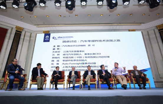 围绕“汽车零部件技术突围之路”,江淮汽车原董事长左延安,威马汽车创始人、董事长兼CEO沈晖,特雷克斯(中国)投资有限公司总经理茅晓鸣,零部件私享会创始人魏威,Auto Foresight董事总经理张豫,上海大郡动力控制技术有限公司总裁徐性怡,佛吉亚排气控制技术开发中国区总裁江永玮展开圆桌讨论,《汽车商业评论》总编辑贾可主持。