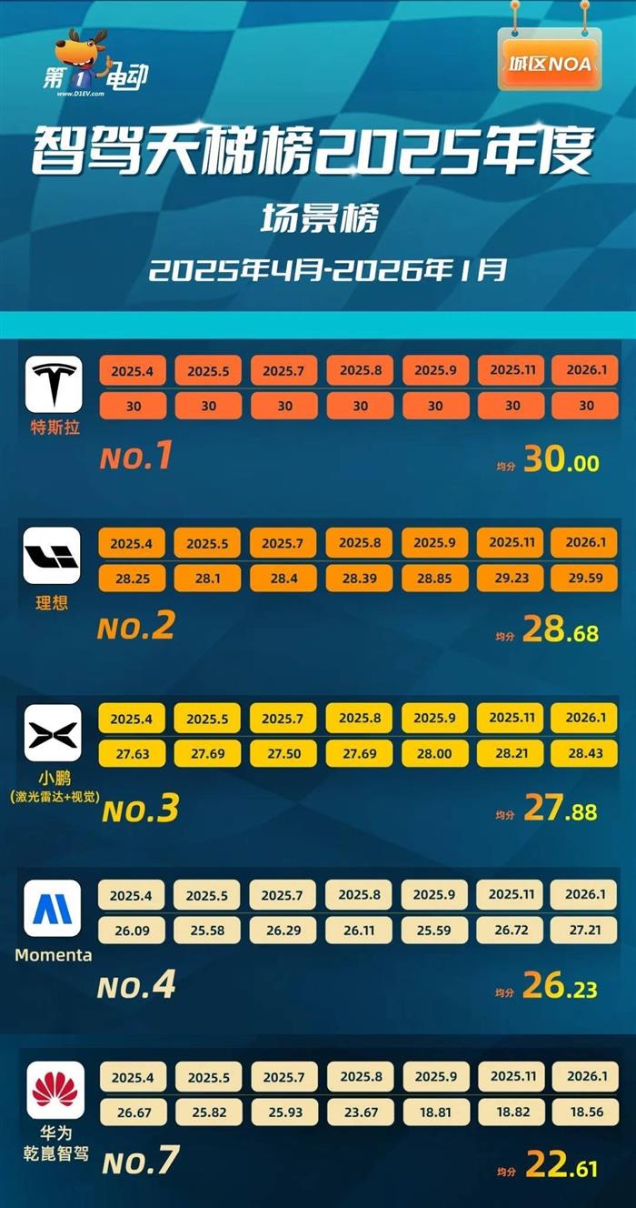 先看四大天王(华为、Momenta、理想、小鹏)智驾天梯榜2025年度汇总成绩单。