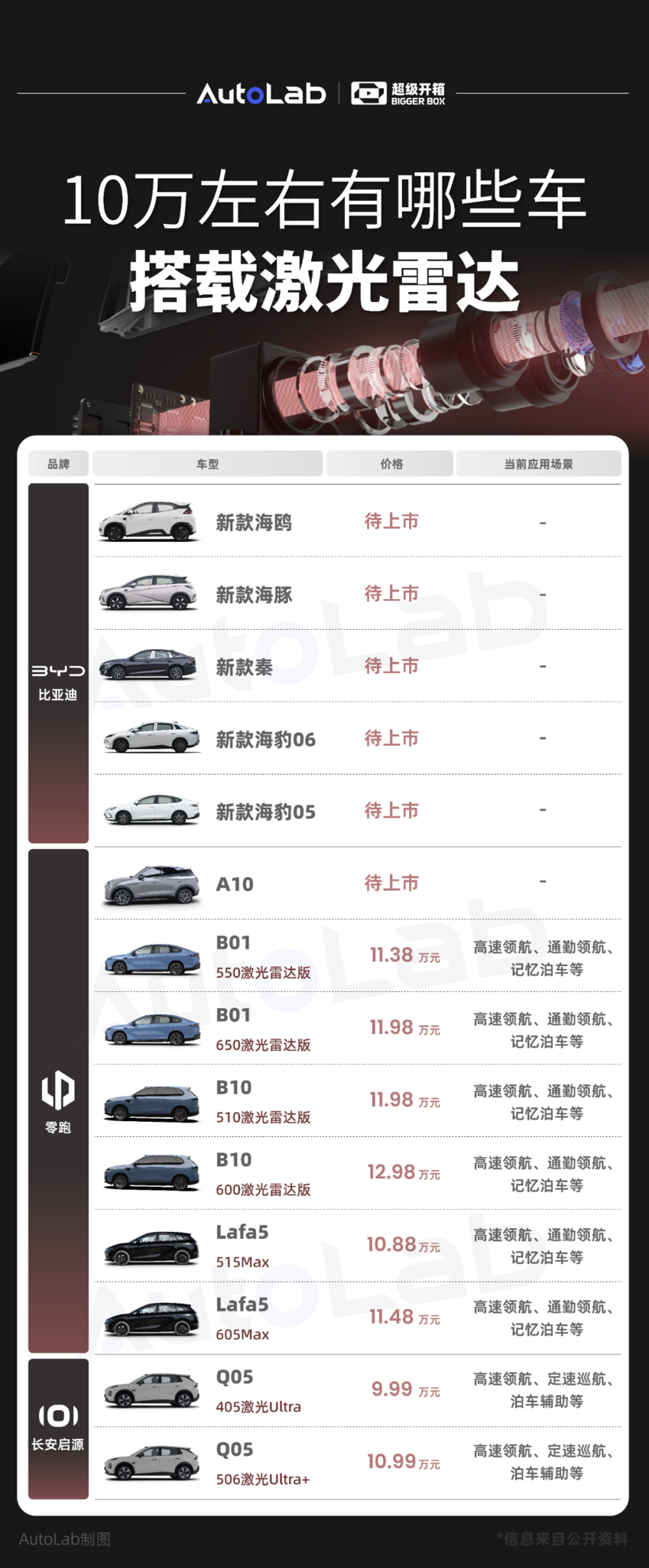 与此同时,包括小车在内,我们也整理了价格在10万左右并搭载激光雷达的车型,希望能给大家在看车、购车时提供参考。