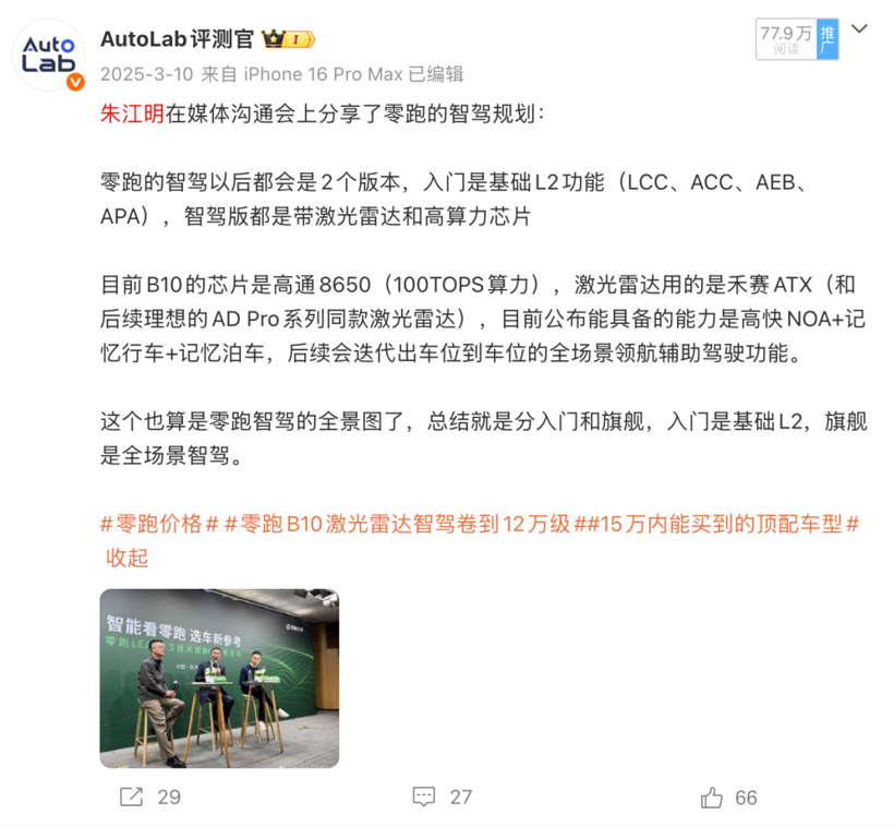 就比如零跑B10激光雷达版,它虽然有激光雷达,但目前只支持高速领航、通勤领航等功能,真正的城区领航或者车位到车位还需要等后续的OTA。