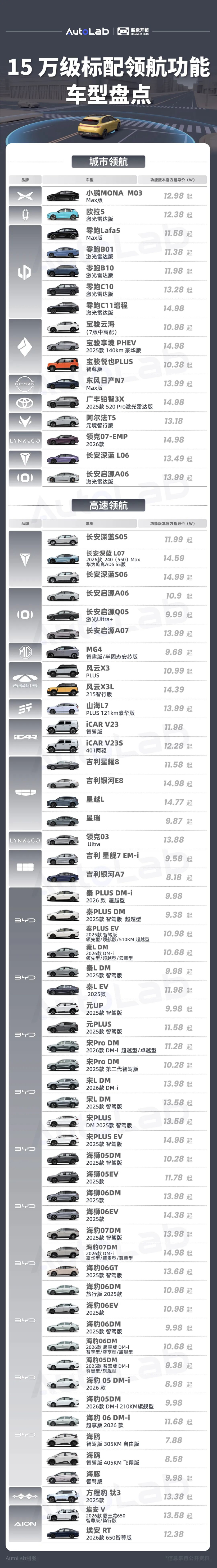 今天我们就来盘点10-15万级市场,看看有哪些车型搭载了高速领航和城区领航功能。