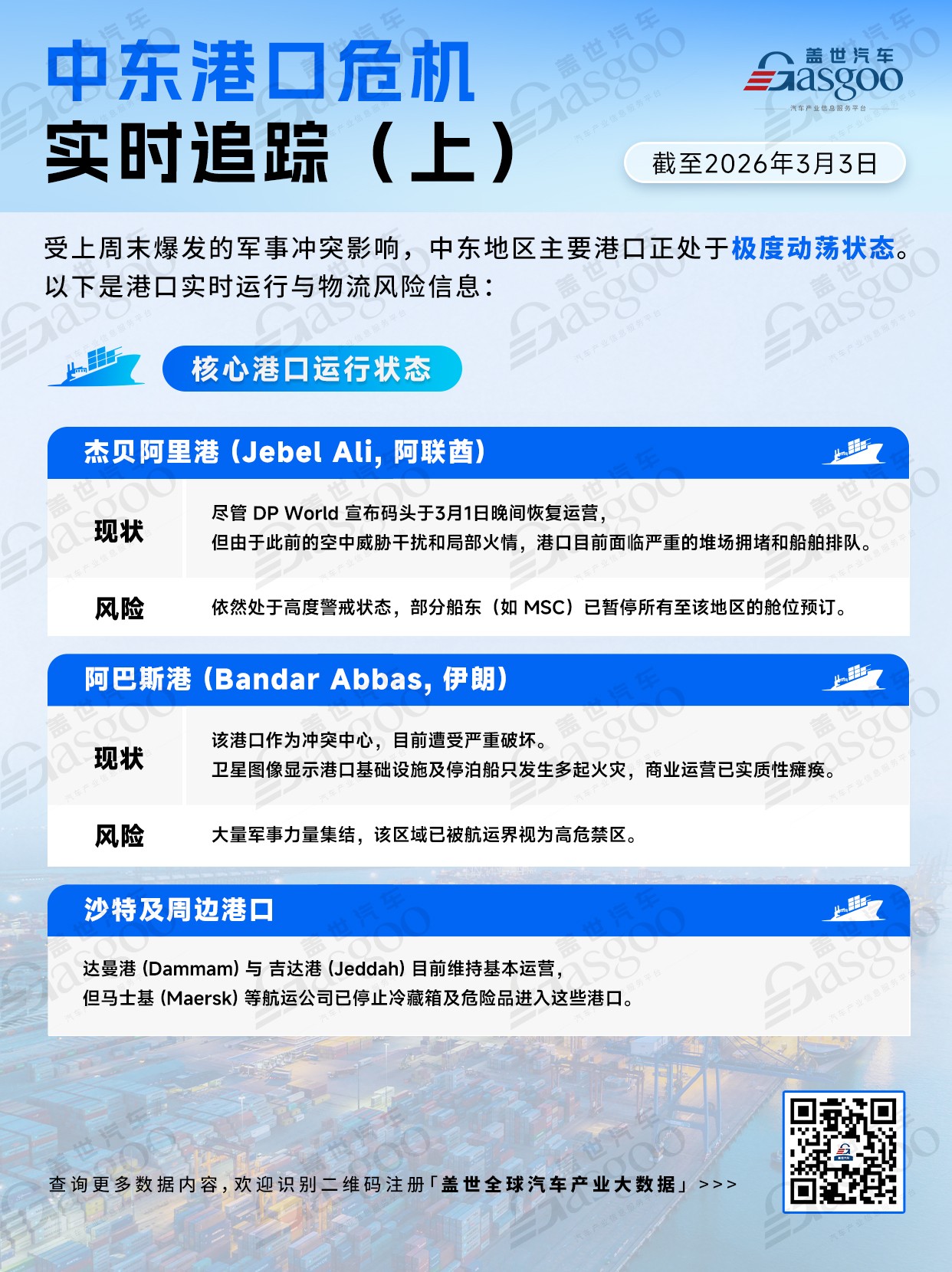 2026年3月中东港口危机持续恶化,阿巴斯港遭毁运营瘫痪,杰贝阿里港拥堵,霍尔木兹海峡与苏伊士运河受限,空运积压、陆运尚通。航运成本激增,战争险取消致无保运行。伊朗工厂或停产2-4周,影子链断裂,红海航线再关,航程延长,金融阻断加剧,区域供应链濒临断裂。