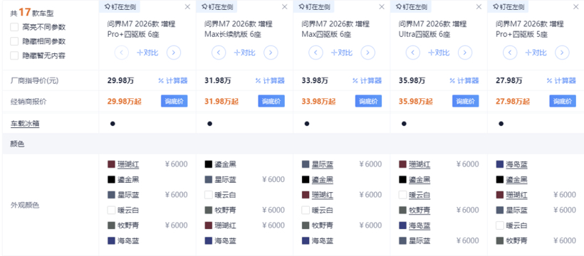 但是可以参考问界M7,大概率这些好看的配色都是要加几千块的。