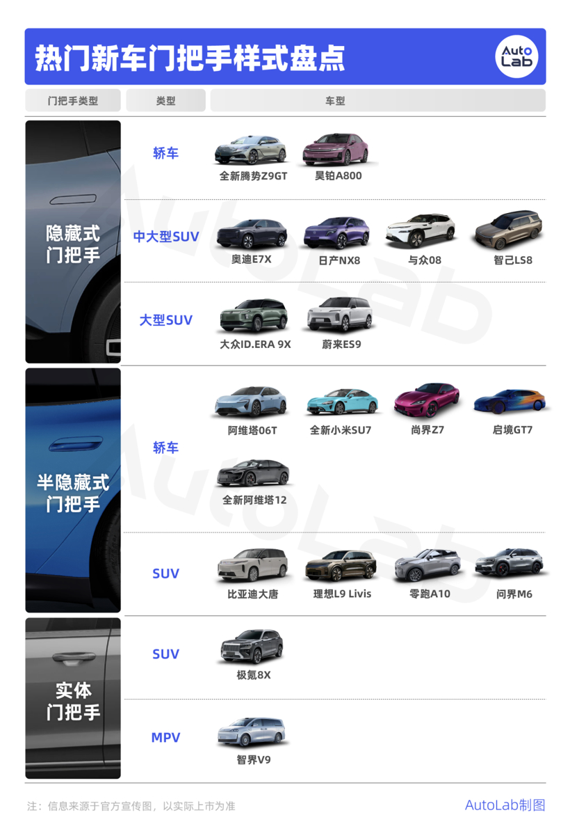 为此,我们盘了盘今年上半年即将亮相或上市的热门新车,按门把手的分类,做了张表。