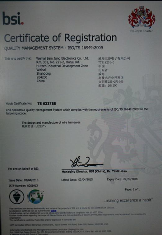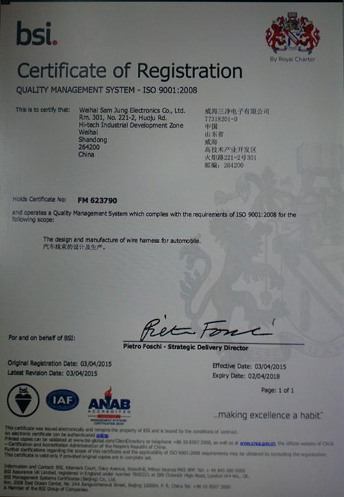 威海三净电子有限公司简介:自公司成立以来,就以品质、信誉、和睦、进取为企业精神,为确保产品质量,公司先后实施了全面的品质管理:5S管理、SPC品质、ERP等先进管理模式,同时为了提高公司生产能力与质量水平,公司引进自动压接机、半自动压接机、自动切断机、APPLICATOR清洗机、切断脱皮机、APPLICATOR/热缩机、耐压测试仪器、切断脱皮机、GROMMET扩张器、ICM检测仪、回路检查仪、标签打印机、DUMMY SEAL & SEAL PIN防漏仪等先进的生产与检测设备,我们严格实行韩国先进的电线束制造工艺和管理方式。公司为进一步完善产品质量及设备维护成立专项实验室,针对线束的电压、端子剖面等进行实时监控。