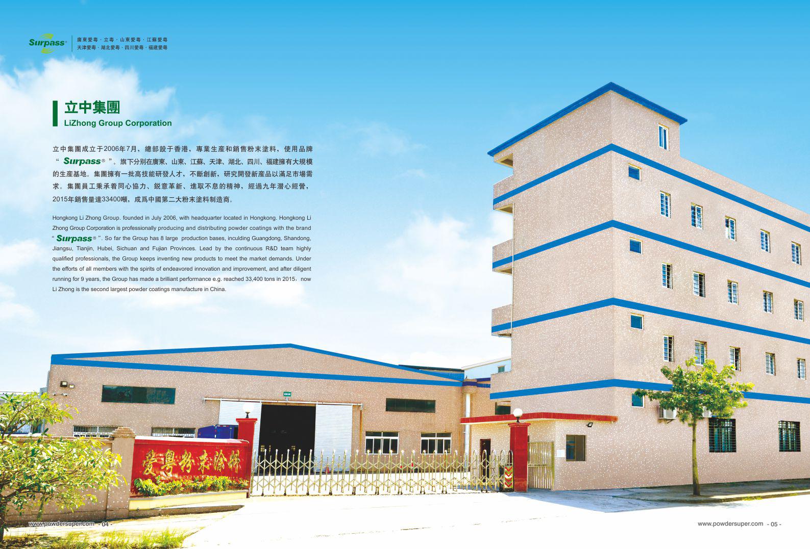 立中集团成立于2006年7月,总部设于香港,专业生产销售粉末涂料,使用品牌“SURPASS”,旗下分别在广东、山东、江苏、天津、湖北、四川、福建拥有大规模的生产基地。立中集团拥有一批高技能研发人才,不断创新、研究开发新产品以满足市场需求。集团员工秉承着同心协力、锐意革新、进取不息的精神,经过多年潜心经营,2011年销售15000吨,2012年销售18000吨,跃升为中国第三大粉末涂料制造商。
