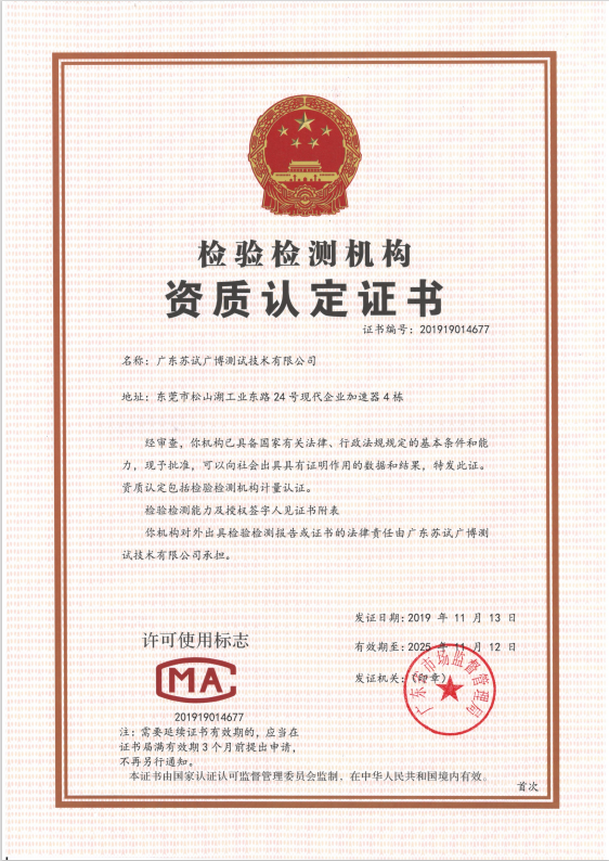 广东苏试广博测试技术有限公司简介:以苏州苏试试验集团股份有限公司业内领先的环境可靠性试验设备生产技术实力为依托,由苏州苏试试验集团股份有限公司与东莞市广博检测设备有限公司以《珠三角经济改革发展规划纲要》为战略指导方针,双方共同投资成立的以军用装备和民用产品为试验检测服务重点,以科学、公正、安全、诚信为建设和服务之本的一家独立于承制方和使用方的第三方环境与可靠性试验测试分析实验室。实验室由国内著名的环境工程专家王德言教授主持,按ISO17025标准建立了完整的质量保证体系,获得了CNAS,CMA,ISTA,武装装备科研生产二级保密单位等资质认可。实验室建有环境可靠性和新能源产品安全以及EMC电磁兼容性测试等共三大测试中心,各类测试设备及仪器数百余台套及一支高素质的试验队伍。